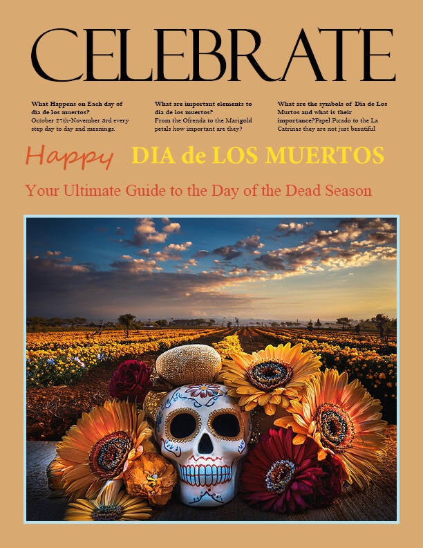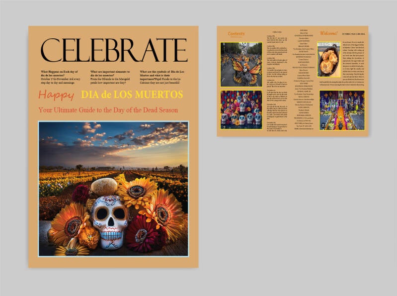 This is the re-make of the Celebrate Magazine. The original version was a Halloween themed. I turned the Halloween theme into Dia de los Muertos theme because not everyone celebrates Halloween. In this re-make I wrote about the actives on the daily during the holiday. I also wrote the article on why this is one of the biggest holiday celebrations in Mexican, Latino, Spanish, and some Caribbean cultures and the importance of the holiday. A.I. was used to create a more modern look, and make the colors more vibrant and well blended.